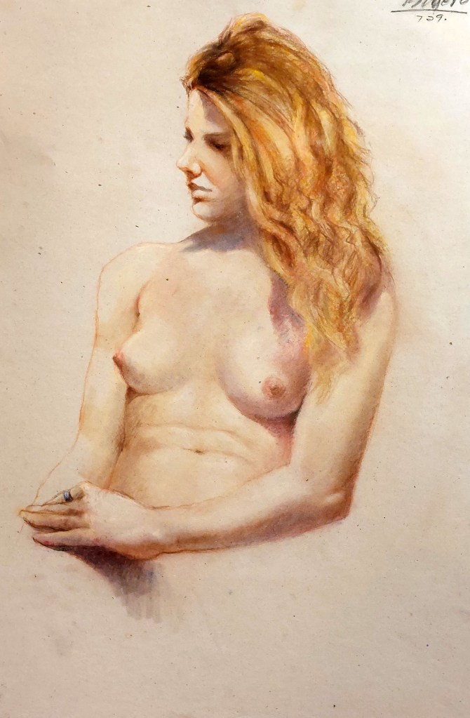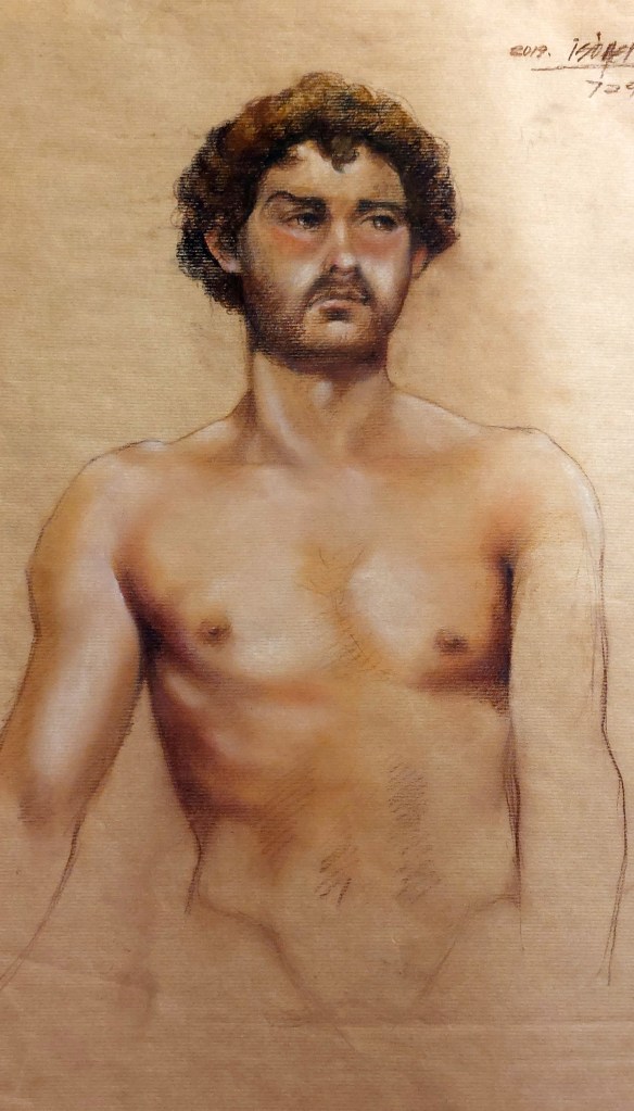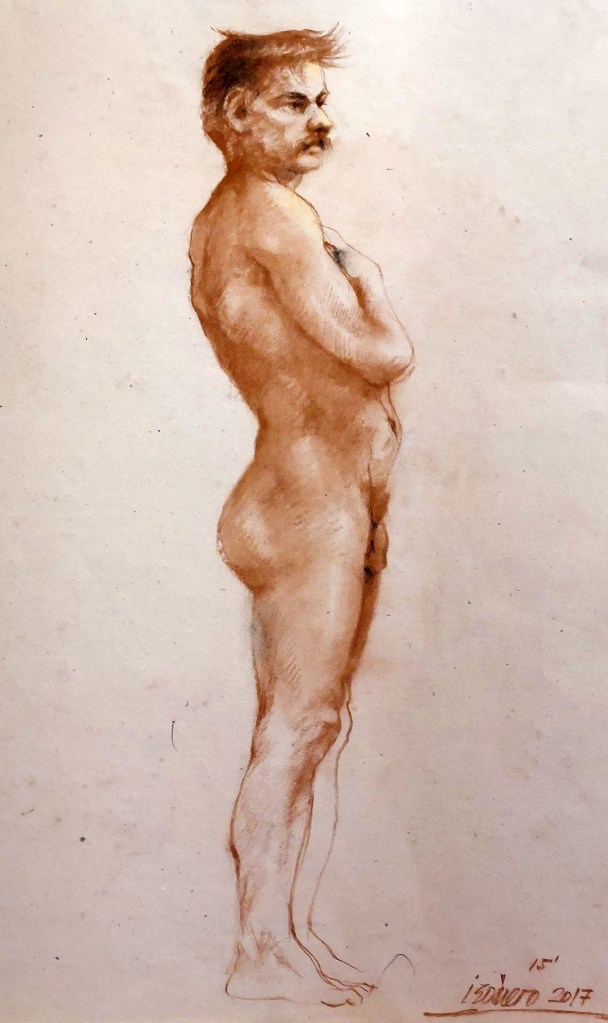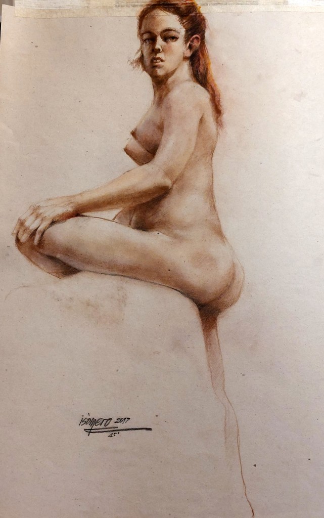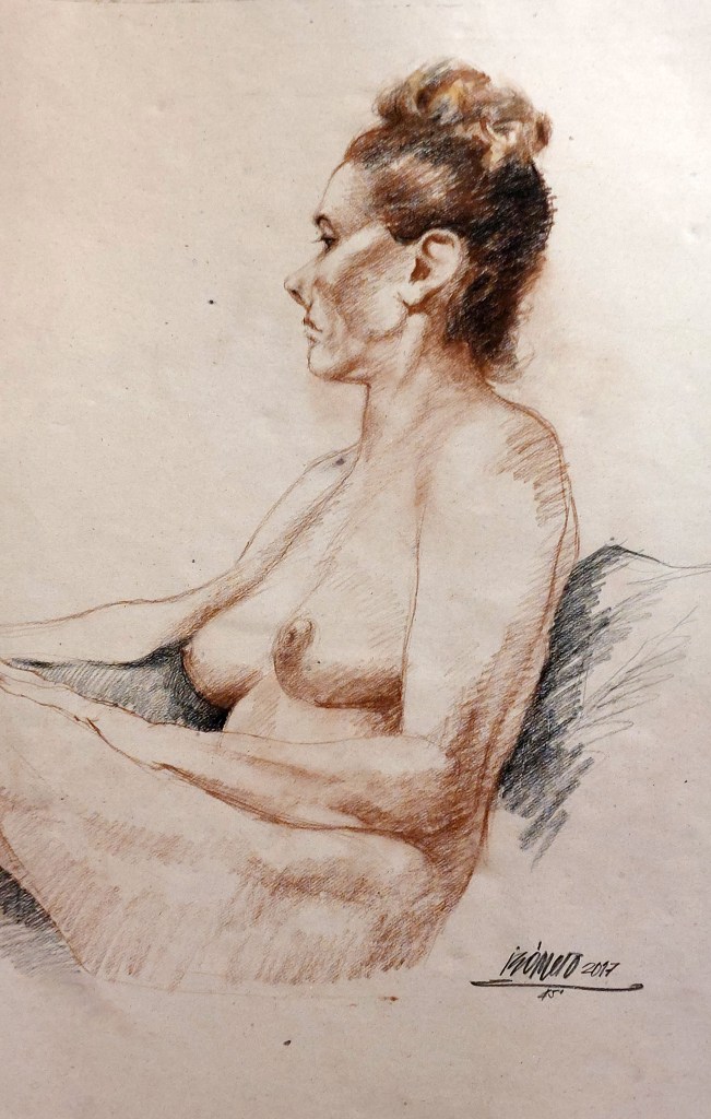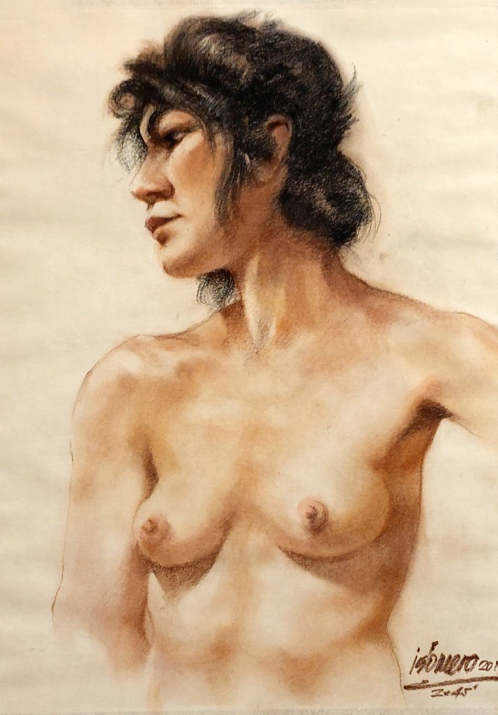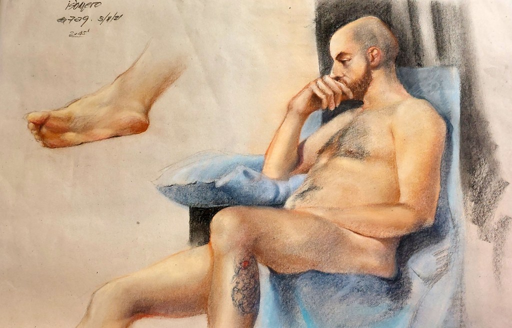 De otra forma, el dibujo apoyado por los modelos de desnudos de Bellas Artes, refleja el realismo de las figuras y sus proporciones, contando con el material empleado (pastel y lápiz conté) y por su rapidez de ejecución con resultados de poses (15, 45 y 2×45 minutos), sin pretender un acabado más preciso.
