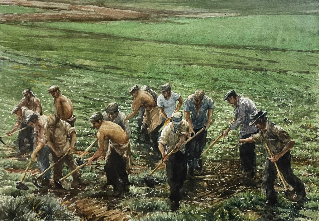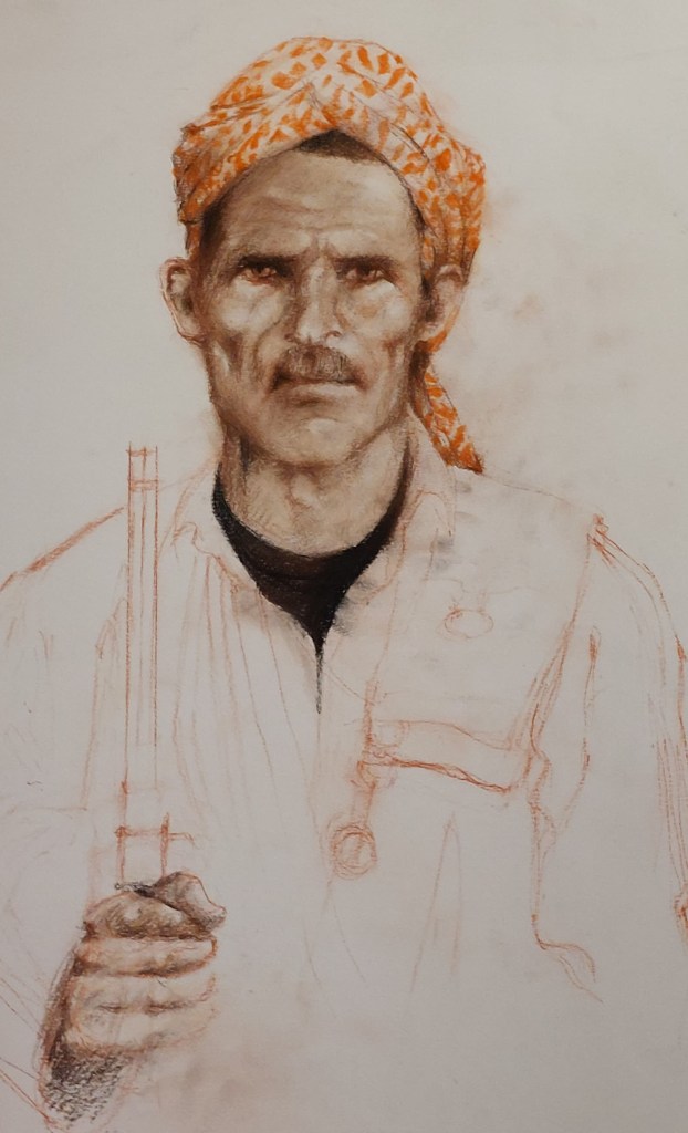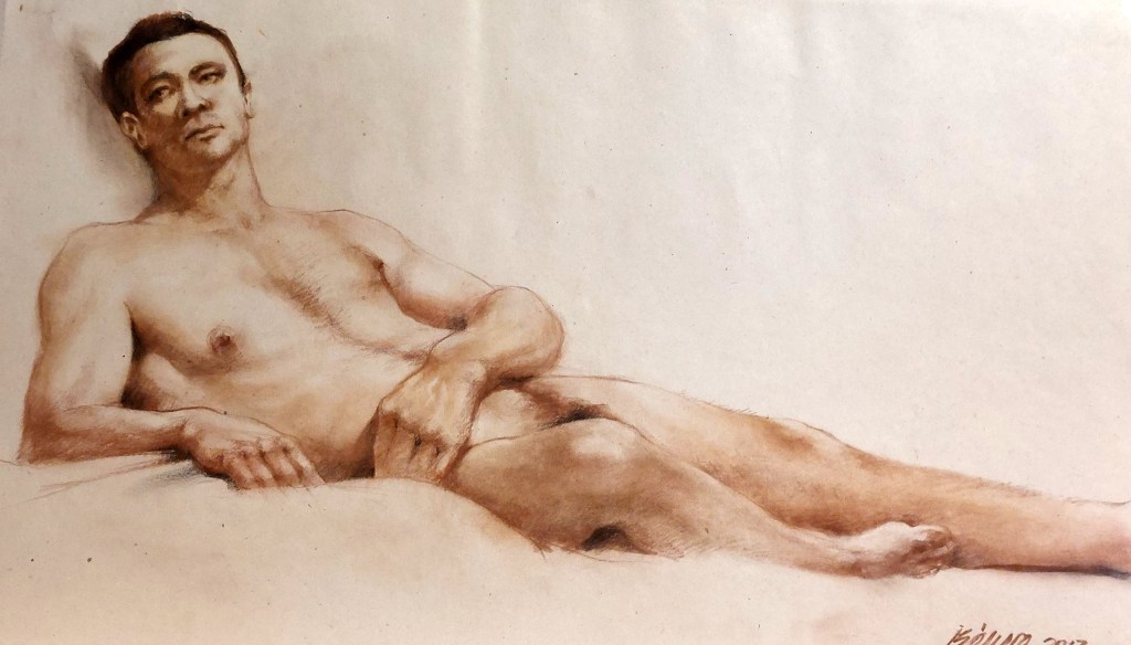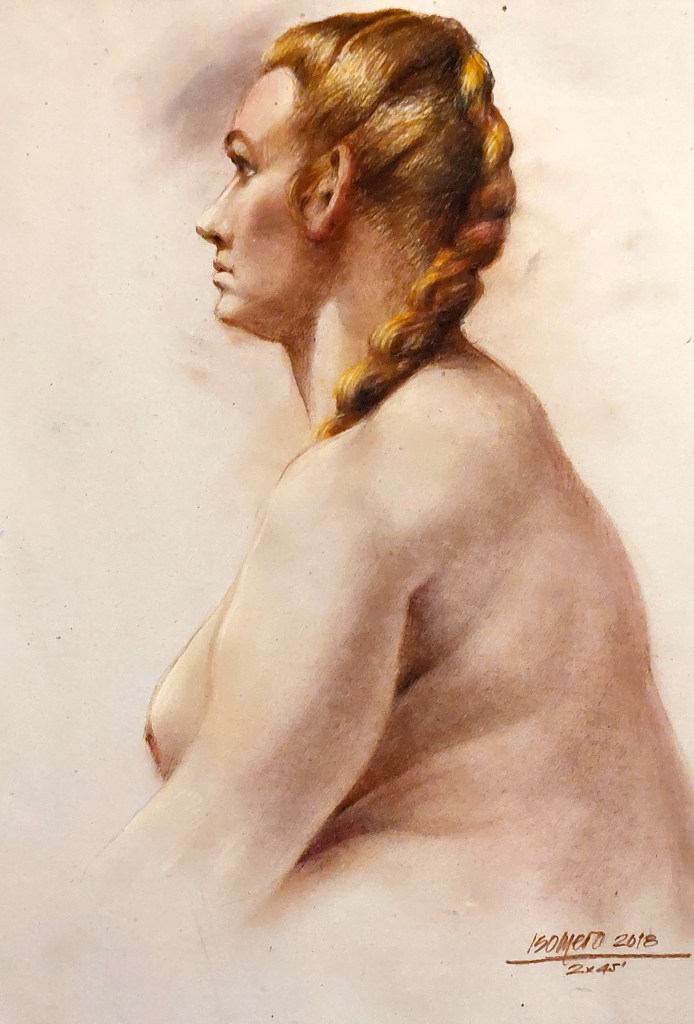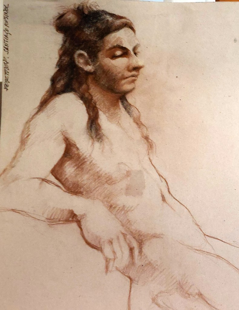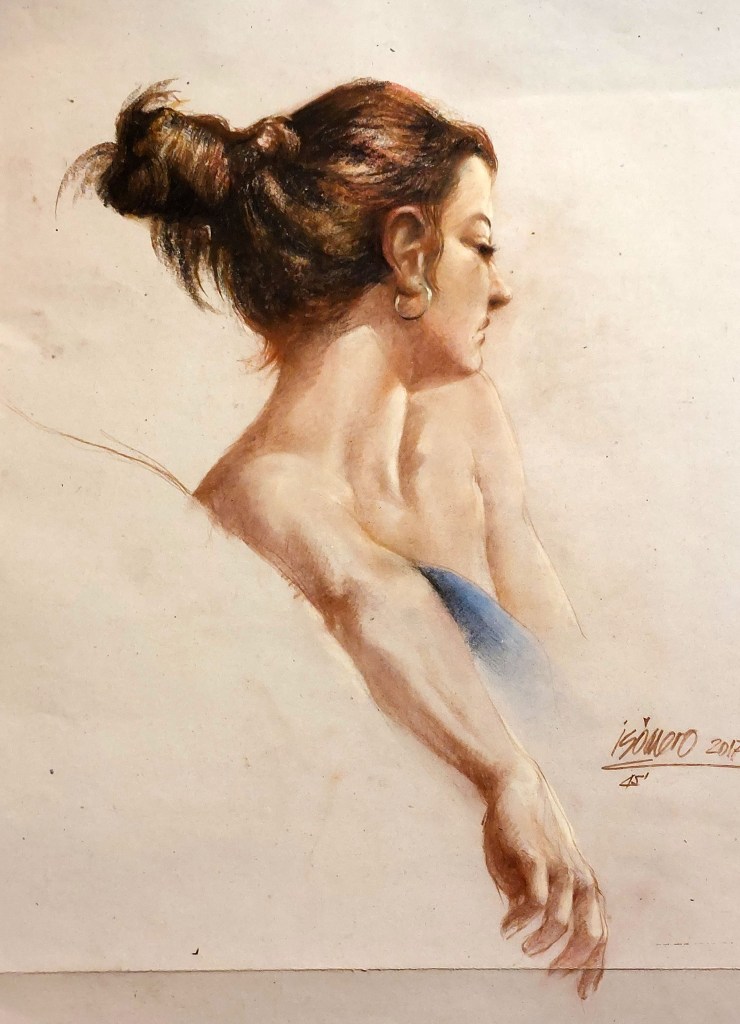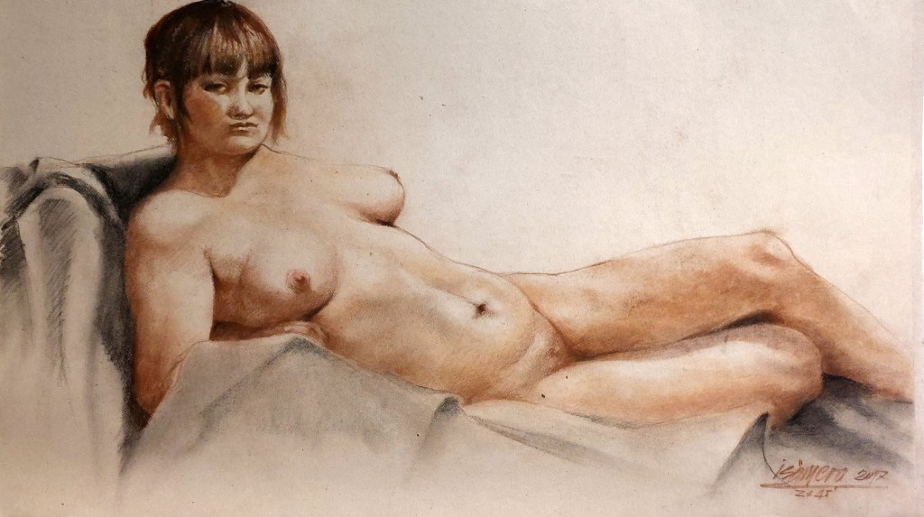 De otra forma, el dibujo apoyado por los modelos de desnudos de Bellas Artes, refleja el realismo de las figuras y sus proporciones, contando con el material empleado (pastel y lápiz conté) y por su rapidez de ejecución con resultados de poses (15, 45 y 2×45 minutos), sin pretender un acabado más preciso.
