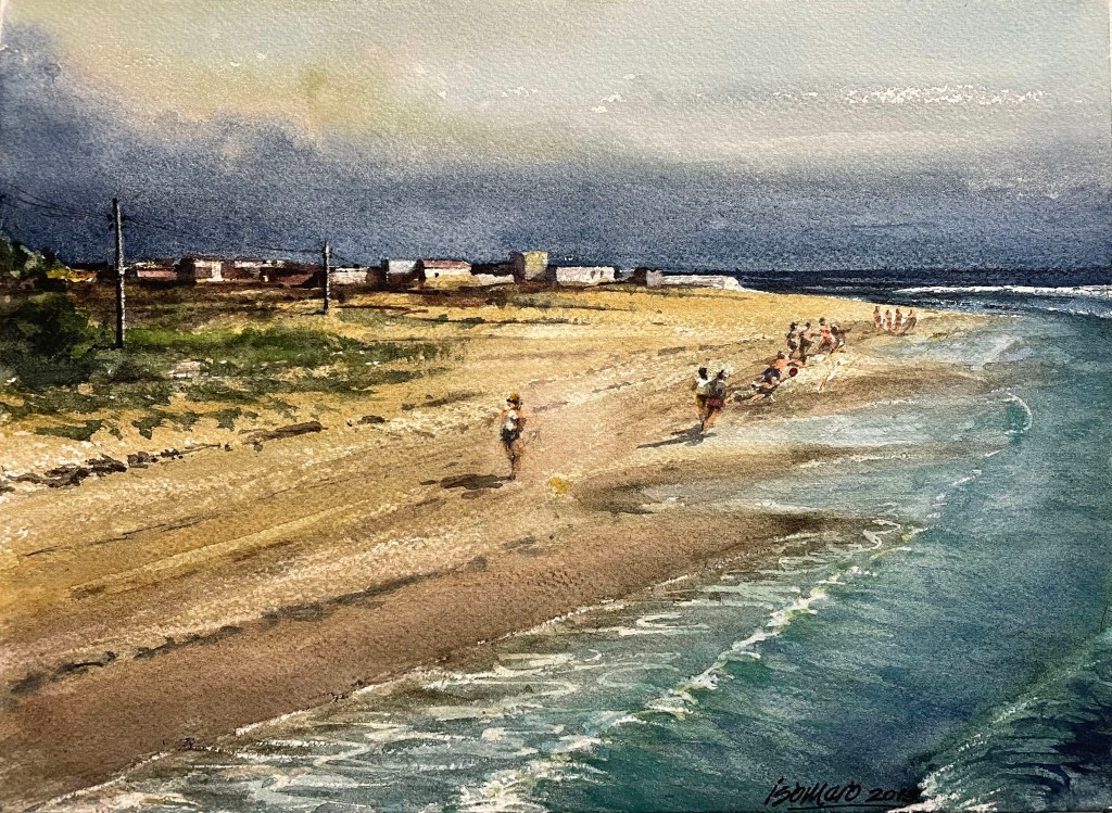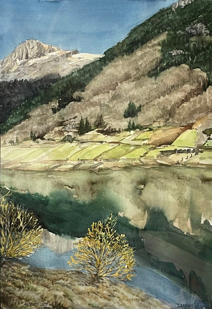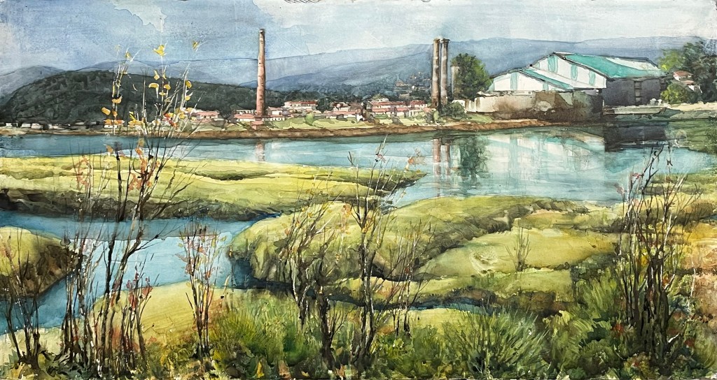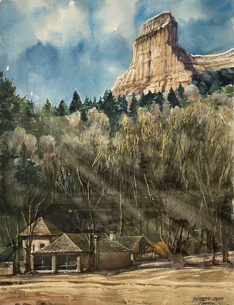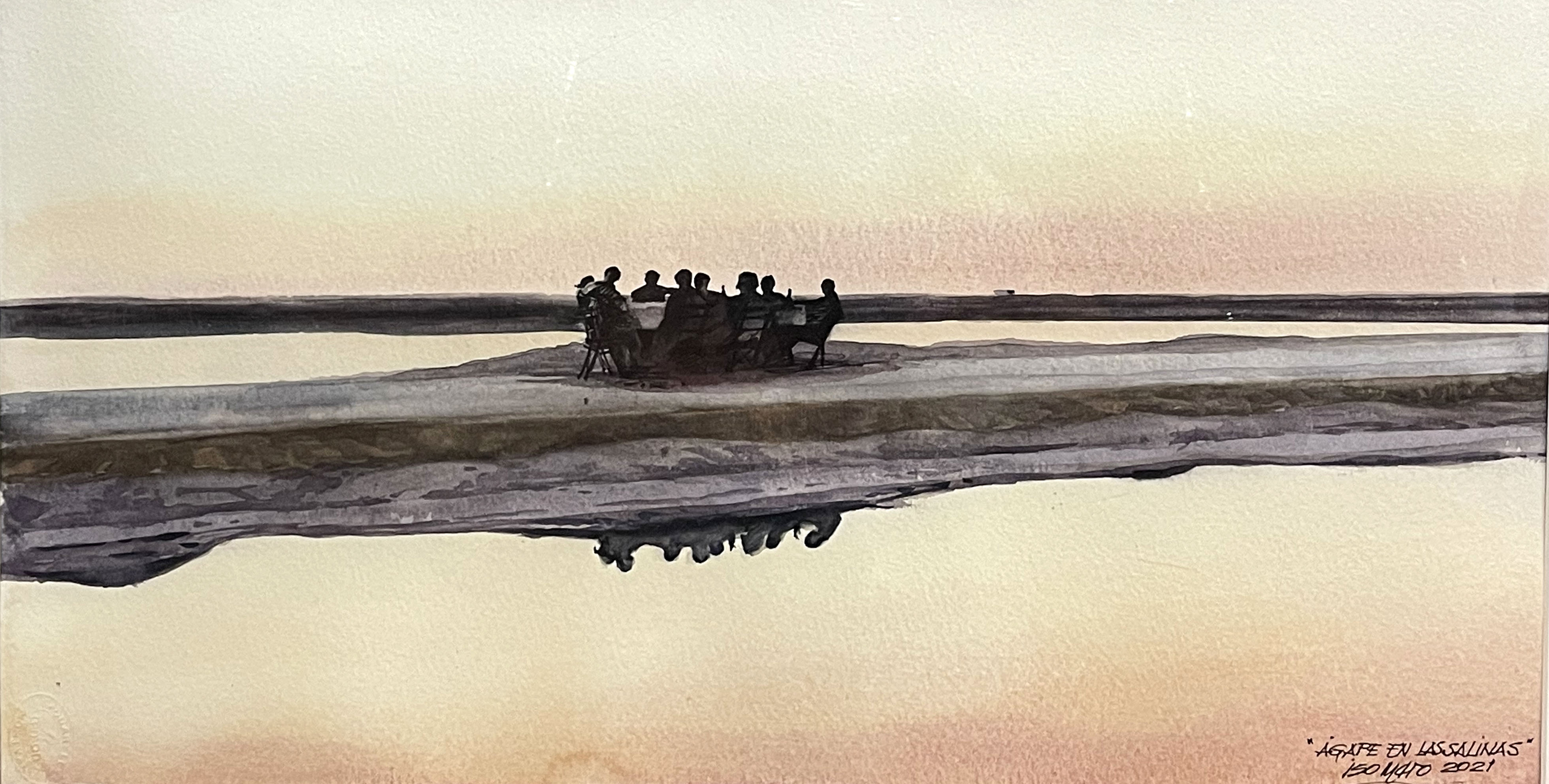 La influencia en la pintura y dibujo de la carrera de Arquitectura se hace notar en el tratamiento de la acuarela, no sólo con el juego de luces y sombras y transparencia del color, sino, además, en la superposición de tintas, característico de la AGUADA.